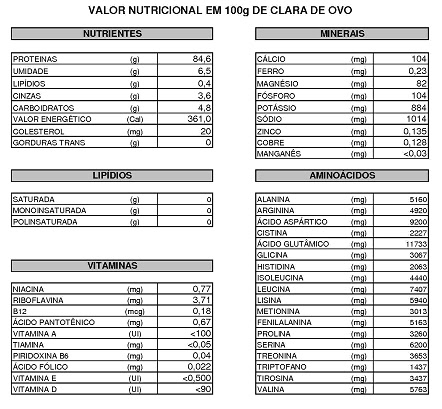Composição Nutricional da AlbuminaOs valores de vitaminas e minerais podem variar dependendo da marca, já que alguns fabricantes, como mencionado acima, adicionam estes nutrientes na composição.Dose UsualA ingestão de albumina assim como a de outros suplementos é indicada de acordo com o treino e dieta do esportista, já que excesso de proteína é descartada pelo organismo não sendo utilizada para a construção de massa muscular (e proteína custa caro!). Mas de um modo geral é sugerido o consumo de 30g de albumina diluído em 200 ml de água e consumida durante o intervalo das refeições ou durante o sono. Essa dose fornece ao esportista aproximadamente 24g de proteína e < de 1g de carboidrato (quando não adicionado pelo fabricante).Algumas pessoas reclamam da espuma que se forma ao bater a albumina no liquidificador. Eis as minhas sugestões: bata junto com 1 colher de azeite. Diminui muito a espuma. Outra dica é preparar o shake com antecedência e deixar descansando por 1 hora. Para quem também reclama do sabor da albumina, uma dica é tomá-la misturada a um suco cítrico (laranja, limão, maracujá). Fica muito bom.RONEY FERREIRA DE PROENÇANutricionistaCRN-3 27016