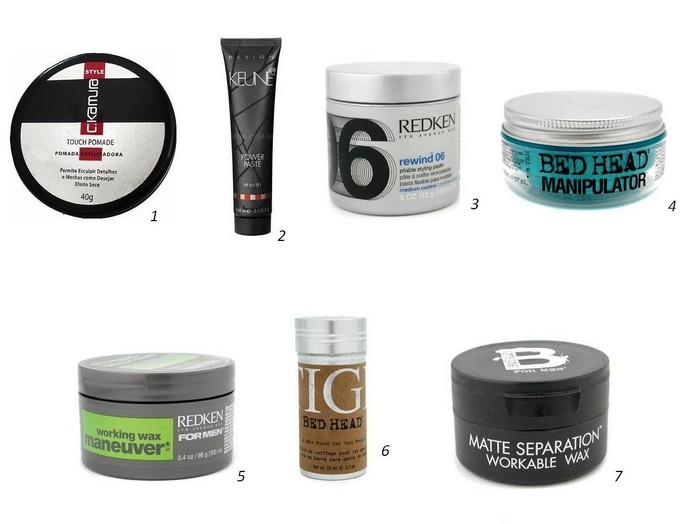 • Peter ,eu nunca usei essas pomadas e ceras,mas meu tipo de corte e cabelo e do tipo que você citou,e para essa fixação mediana e sem brilho eu uso o Gatsby Moving Rubber cor rosa ele tem um efeito muito bom e um bom custo/beneficio (da pra achar por R$40,00 e rende muito).