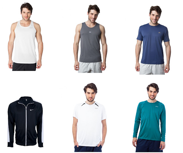 – Regata Branca Asics (R$ 59,90) – Regata Cinza Mizuno (R$ 69,90) – Camiseta Azul Mizuno (R$ 79,90)